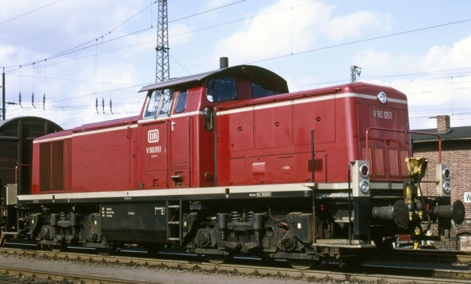 Die V90 051 rangiert i1968 n Hamburg-Wilhelmsburg. Gut zu erkennen die damals recht neuen Rangierkupplungen. Copyright: Will A. Reed / Slg. Eisenbahnstiftung
