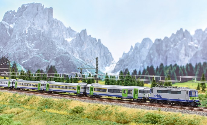 Die GoldenPass Linie führt Sie an malerischen Dörfern mit schönen Bauernhäusern, an Wäldern, Wildbächen und Alpenseen vorbei. Interlaken, Spiez, das Saanenland mit dem mondänen Gstaad - alle diese Orte liegen an der abwechslungsreichen Route. Besonderes Highlight dieser Fahrt ist die Reise im gediegenen Belle-Èpoque - Abteil von Zweisimmen nach Montreux." so beschriebt die BLS selbst ihr Pananoramezug-Angebot. Das MINITRIX-Modell stellt den gesamten Zug inkl. Steuerwagen nach.
