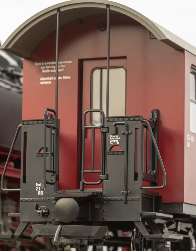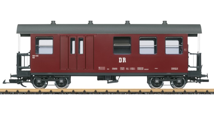 Modell eines Personenwagens mit Gepäckabteil der Deutschen Reichsbahn aus dem Netz der Harzer Schmalspurbahn. Originalgetreue Farbgebung und Beschriftung der DR Epoche IV. Viele angesetzte Details, Inneneinrichtung mit Toilette. Metallradsätze. Länge über Puffer 50 cm.