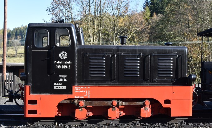 Die heutige 199 009-2 hat ihr Lokomotiv-Leben als Werklok in der Papierfabrik in Schönfeld-Wiesa im Jahr 1964 begonnen. 1985 wechselte die Lok nach Wilichthal, ebenfalls in eine Papierfabrik. Nach der Schließung der Fabrik im Jahr 1995 übernahm der Pressnitztalbahn die Maschine mit der Fabriknummer 250337 und setz sie seit dem als universelle Lok vor verschiedenen Zuggattungen ein. Dabei kommt die Lok sowohl vor Reisezügen als auch vor Bau- bzw. Güterzügen zum Einsatz. Ihre Farbgebung hat die Lok im Übrigen auch ihrer Zeit als Werklok mitgebracht. Soweit es heute noch vollständig nachvollziehbar ist, war die Lok von Beginn an schwarz lackiert, mit rotem Fahrwerk.